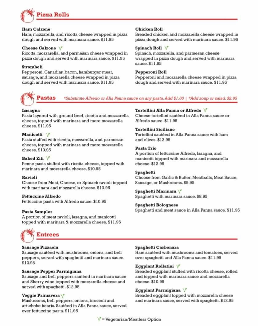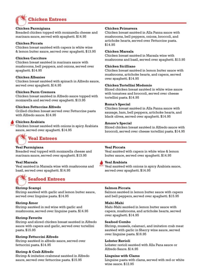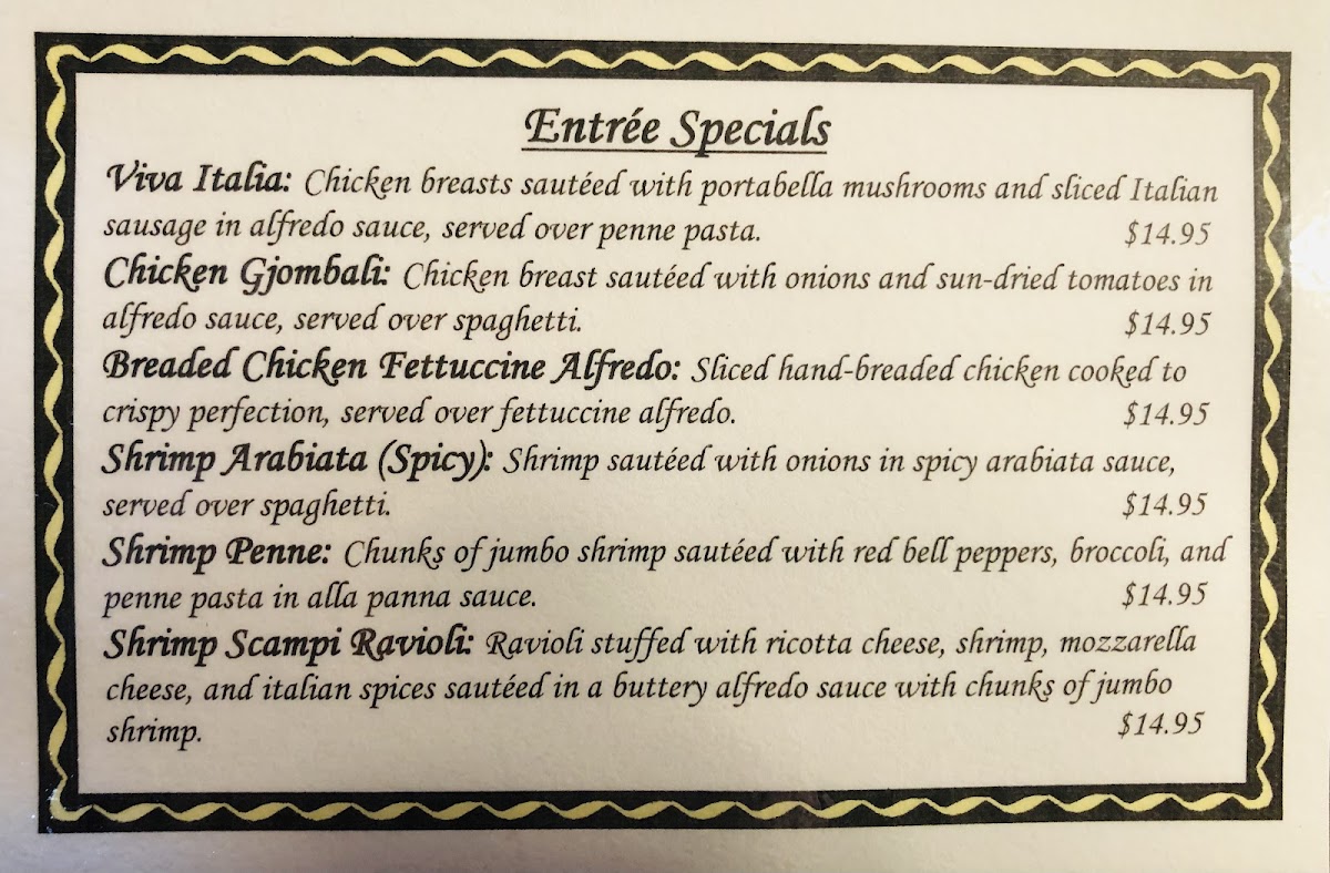 - Main Course Highlights: House special featuring shrimp and chicken sautéed with spinach and mushrooms in a creamy Alfredo sauce, topped with mozzarella over penne.
