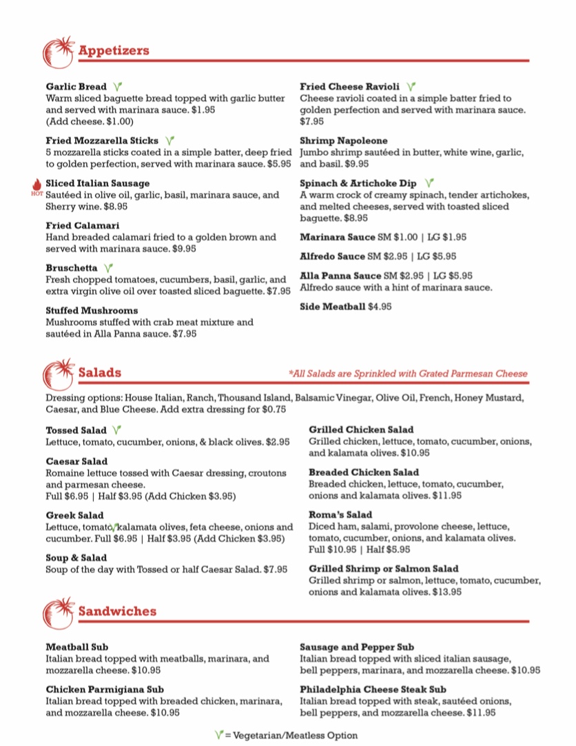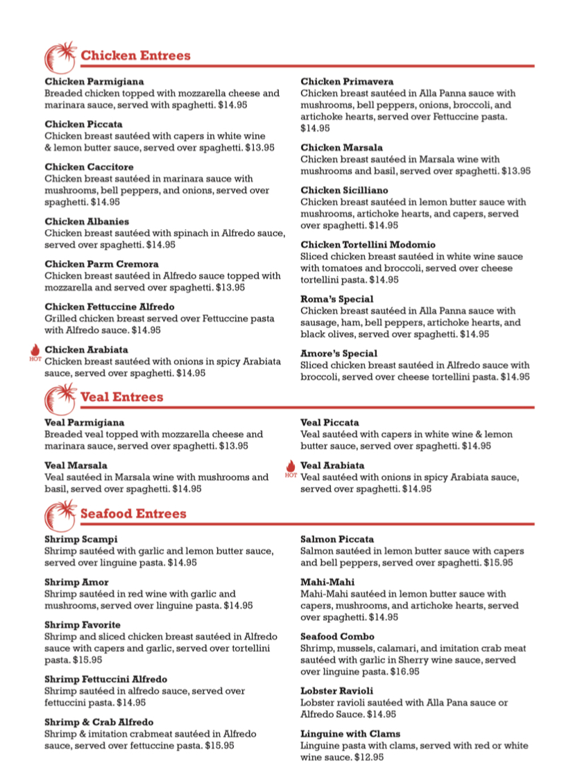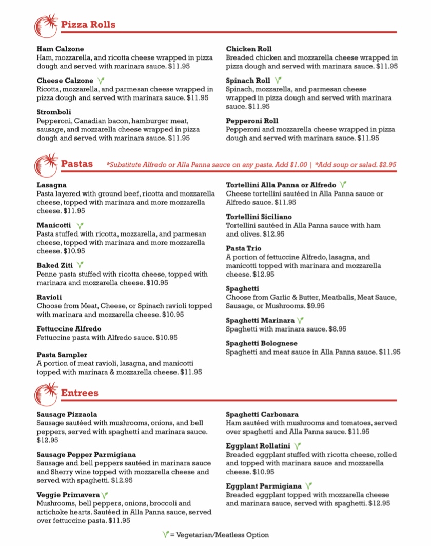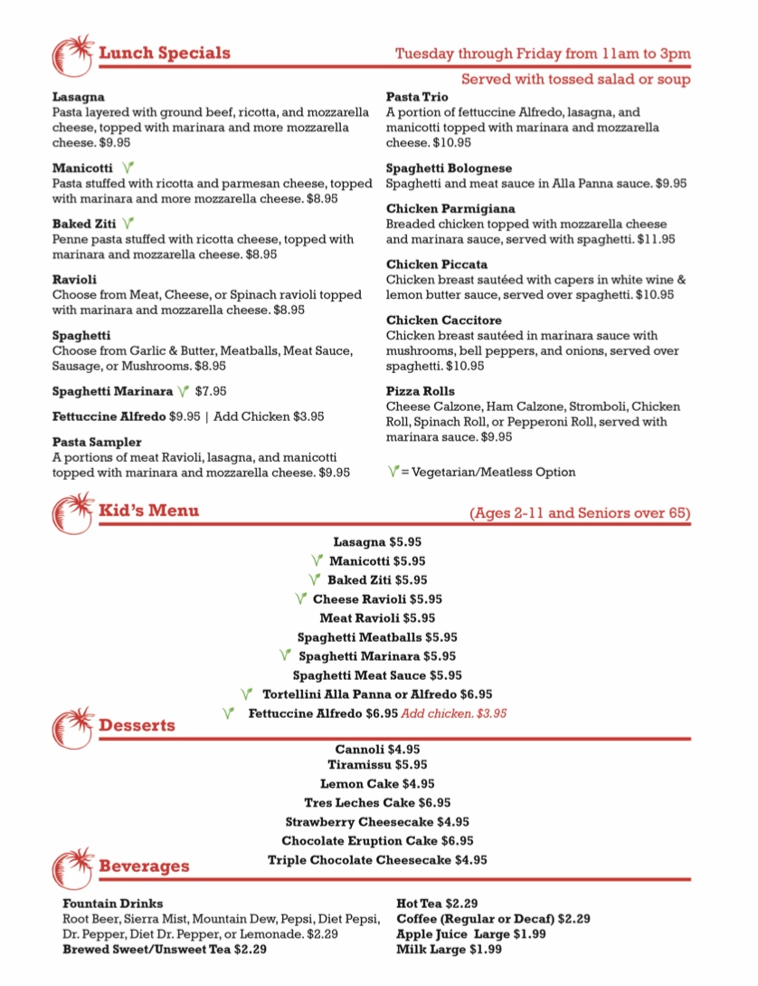 - Main Course Highlights: House special featuring shrimp and chicken sautéed with spinach and mushrooms in a creamy Alfredo sauce, topped with mozzarella over penne.